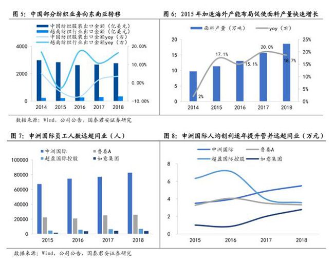 2018年,申洲国际、鲁泰A、超盈国际控股、如意集团的总营收分别为209.7亿元(+15.8%)、68.8亿元(+7.3%)、28.3亿元(+20.1%)、13.3亿元(+11.3%),申洲国际规模是行业第二名的3倍多,规模优势明显。